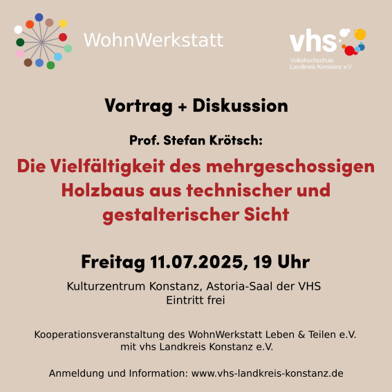 Mit den Zielen des Klimaschutzes und nachhaltigen Bauens gewinnt das Bauen mit Holz (wieder) zunehmend an Bedeutung. Während der moderne Holzbau längere Zeit weitgehend auf kleinere Gebäude beschränkt blieb, verließ er in den letzten Jahren die Nische und ist in der Breite angekommen. Auch in der Stadt Konstanz wurden in den vergangenen Jahren mehrere mehrgeschossige Gebäude in Holzbauweise errichtet. Für die nächsten Jahre ist u.a. die Bebauung der «Christiani-Wiesen» mit dem Modellquartier «Am Horn» durch Baugruppen geplant, wobei das Bauen mit Holz eine Voraussetzung für die Vergabe der Grundstücke ist.Prof. Krötsch gibt in seinem Vortrag einen Überblick über das moderne Bauen mehrgeschossiger Häuser mit Holz. Anschließend besteht die Möglichkeit zu Fragen und Diskussion.